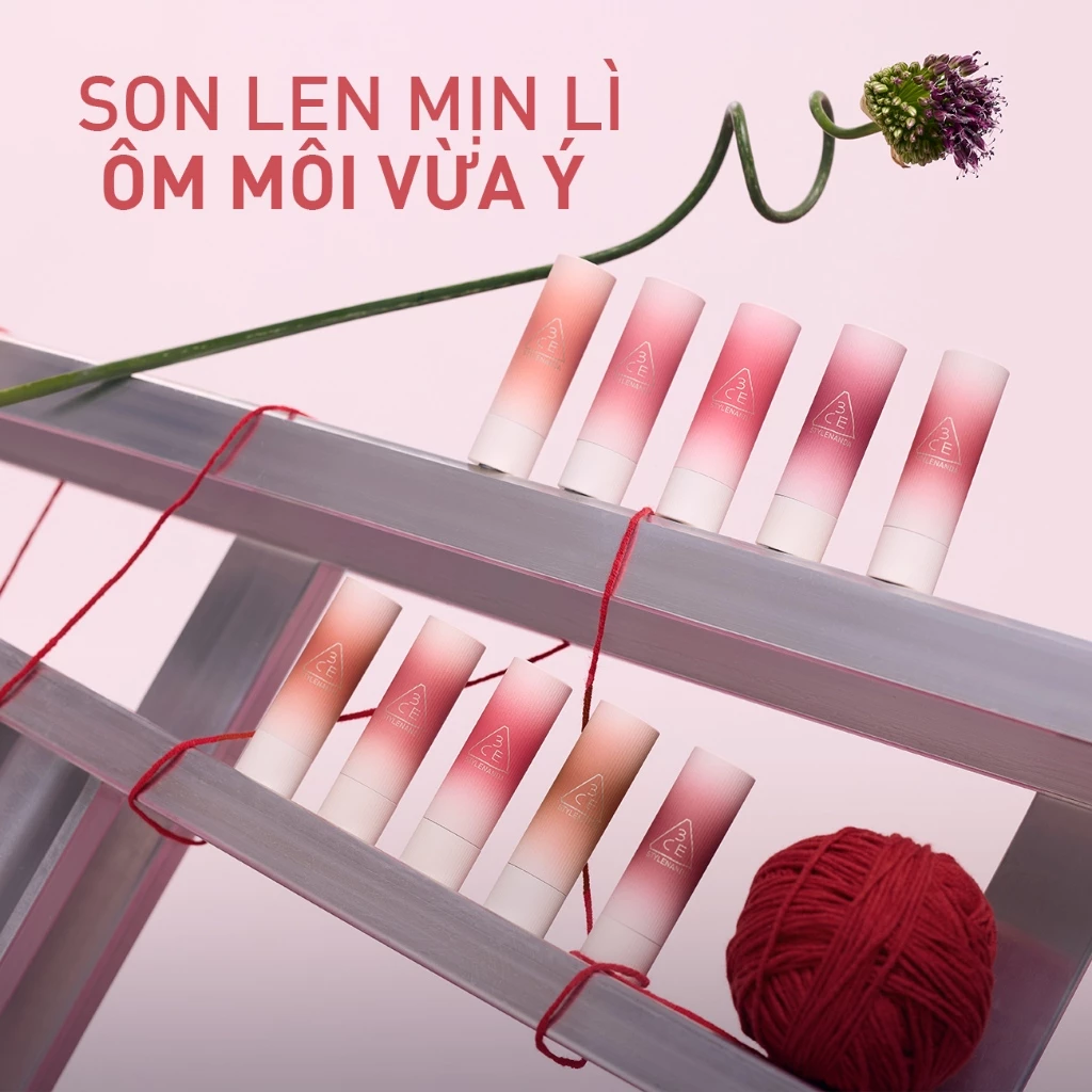 3CE Cashmere Hug Lipstick là dòng son lì cao cấp với kết cấu mềm mịn như nhung, mang lại cảm giác “ôm môi” nhẹ nhàng đúng như tên gọi. Chất son glide mượt khi thoa, tạo hiệu ứng blur che vân môi, giúp đôi môi trông đầy đặn và tự nhiên hơn.